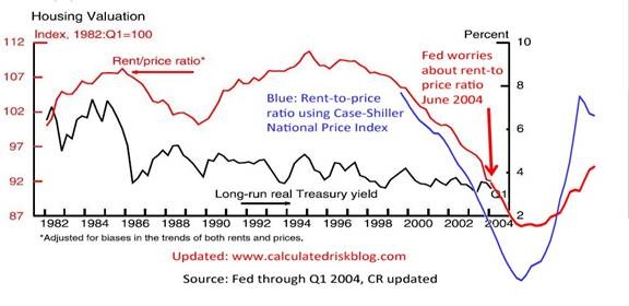 The Fed was looking at a ratio calculated by one of its researchers that saw rents had plunged to less than 2 percent of housing prices in 2004, due to soaring home prices. “I don’t want to leave the impression that we think there’s a huge housing bubble,” said the Fed’s associate director of research. “We believe a lot of the rise in house prices is rooted in fundamentals. But even after you account for the fundamentals, there’s a part of the increase that is hard to explain”.
