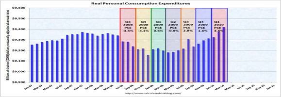 First quarter GDP growth was 3.2 percent, the third consecutive quarter of economic growth. Both residential and non-residential investment are still a drag on growth, so that equipment and software investment are pulling us out of the recession. But it looks like housing construction (i.e., residential investment) is poised to become a positive factor. Note that the recession probably ended in mid-2009, according to Calculated Risk.