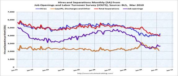 So the recovery is finally beginning for Main Street. I like Calculated Risk’s chart on this. According to the Labor Department’s JOLT report (Job Openings and Labor Turnover Summary), there were 4.242 million hires in March (Seasonally Adjusted), and 4.016 million total separations, or 226 thousand net jobs gained. Notice that total job separations have been dropping since January ‘09, while the number of both job openings and hires has been rising since mid-2009, the probable end of this recession.