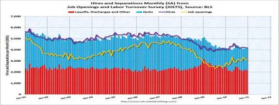 There is more good news on the hiring front. The Labor Department’s latest Job Openings and Labor Turnover Survey (JOLTS) said the number of job openings in December was 3.1 million (yellow line on graph), which was little changed from 3.2 million in November. Since the most recent series trough in July 2009, the level of job openings has risen by 0.7 million, or 31 percent. In December, about 4.162 million people lost (or left) their jobs, and 4.184 million were hired (this is the labor turnover in the economy) adding 20 thousand total jobs. Even with the decline in December, thought, job openings (yellow) are up significantly over the last year.