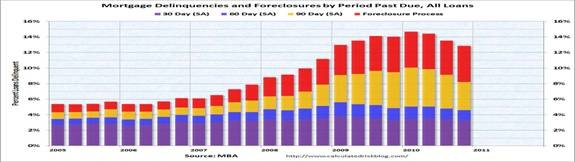 Jay Brinkmann, MBA’s chief economist said “These latest delinquency numbers represent significant, across the board decreases in mortgage delinquency rates in the US. Total delinquencies, which exclude loans in the process of foreclosure, are now at their lowest level since the end of 2008. Mortgages only one payment past due are now at the lowest level since the end of 2007, the very beginning of the recession. Perhaps most importantly, loans three payments (90 days) or more past due have fallen from an all-time high delinquency rate of 5.02 percent at the end of the first quarter of 2010 to 3.63 percent at the end of the fourth quarter of 2010, a drop of 139 basis points or almost 28% over the course of the year. Every state but two saw a drop in the 90-plus day delinquency rate and the two increases were negligible.”