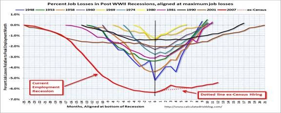 December and January payrolls were also looking better. The change in total nonfarm payroll employment for December was revised from +121,000 to +152,000, and the change for January was revised from +36,000 to +63,000. The only real weakness was in government employment, which fell by 30,000. Local governments, many struggling with budget pressure, have cut 377,000 jobs since September 2008.