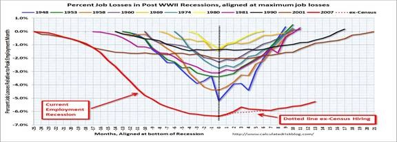 Why so little inflation? Because two-thirds of product costs are labor costs, and incomes are barely keeping up with living expenses, as we said. We will know when there is sufficient demand to push up overall prices, when consumers stop looking for bargains and are willing to pay for higher prices in other than the necessities. And that won’t happen until most of those 7.1 million have found work again.