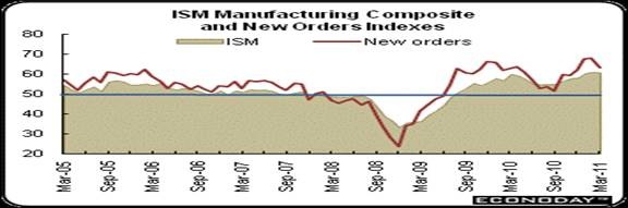 And so we still have to rely on manufacturing and booming exports for any growth at all. New orders, export orders and backlog orders slowed during March in an otherwise solid ISM manufacturing report. The composite headline index, which got a big lift from a slowing in supplier deliveries and from continued strength in production and employment, edged back only two tenths to a still very strong 61.2 that indicates month-to-month growth in overall activity at roughly the same level as February.