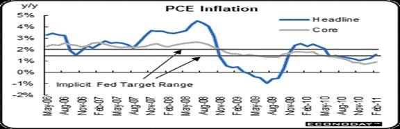 But we are seeing very little overall inflation in overall Personal Consumption Expenditures, even with exploding oil and food prices, which have more to do with the Mideast worries and droughts than longer term demand factors. On a year-ago basis, PCE prices are up just 1.6 percent in February—up notably from 1.2 percent the month before. Core inflation nudged up to a 0.9 percent year-on-year pace versus 0.8 percent in January, still below the Fed’s target range of 1.5 to 2 percent.