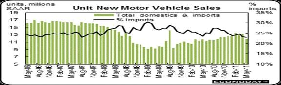 One reason for what looks like a temporary slowdown, is that sales of combined North American-made vehicles and imports dropped to an annualized 11.8 million units from 13.2 million in April. The North American component declined to 9.1 million from 10.1 million.