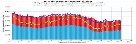 So savvy investors should not be reacting to the initial headlines. For instance, the most accurate unemployment picture is given by the Bureau of Labor Statistics JOLTS report, which lags the unemployment report by 2 months. It is a survey of actual job openings/layoffs. It’s latest report is for November, which showed 3.2 million openings, unchanged from October. Although the number of job openings remained below the 4.4 million openings when the recession began in December 2007, the level in November was 1.0 million higher than in July 2009 (the most recent trough for the series). The number of job openings has increased 30 percent since the end of the recession in June 2009.