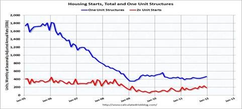 But Single-family starts increased 4.4 percent to 470,000 in December – the highest level in 2011, and the highest since the expiration of the tax credit. This should give a boost to 2012 growth.