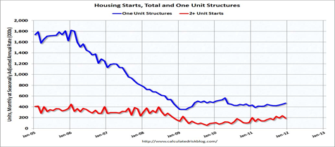 But Single-family starts increased 4.4 percent to 470,000 in December – the highest level in 2011, and the highest since the expiration of the tax credit. This should give a boost to 2012 growth.
