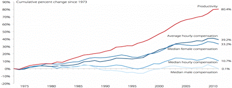 And this is in spite of record corporate profits, which belies the ideology that greater tax cuts (even abolishing corporate taxes) will bring greater prosperity. In fact, as corporate profits have risen over the past 30 years, workers’ incomes have fallen. A recent New York Times’ article highlighted recent revisions of 2010 and 2011 Department of Commerce data. The new figures indicate that corporate profits accounted for 14 percent of the total national income in 2010, the highest proportion ever recorded. The previous peak, of 13.6 percent, was set in 1942 when the need for war materials filled the order books of companies at the same time as the government imposed wage and price controls, holding down the costs companies had to pay.