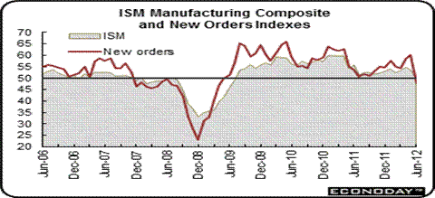 However, the ISM’s manufacturing index showed contraction in June for the first time since July 2009, declining to 49.9 (breakeven at 50) from 53.5 in May. Forward momentum hit the wall at the new orders index, at 47.8 in June versus a huge 60.1 the month before. It showed contraction for the first time since April 2009 and the degree of the decline was the steepest since October 2001, but the large drop is suspicious, as the factory orders component rose more than expected. For what it’s worth, said Econoday, the October 2001 drop in orders was followed by an almost equal rebound the next month and was above the pre-drop level the second month afterwards.