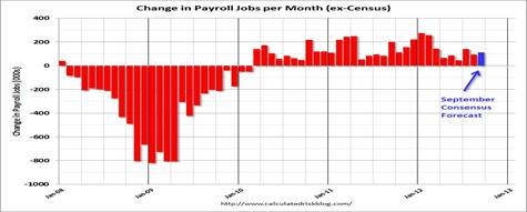 The Bureau of Labor Statistics gave markets a shot of good news recently, when it revised the one year March-to-March 2012 jobs totals upward by 32,000 per month. This was huge and showed much better jobs growth than initially forecast by the Labor Dept., with the private sector providing 453,000 additional jobs March-to-March Q1, and a 386,000 net total with government job losses included. We have to wait until this Friday to know if September’s unemployment report more accurately reflects the current unemployment picture.