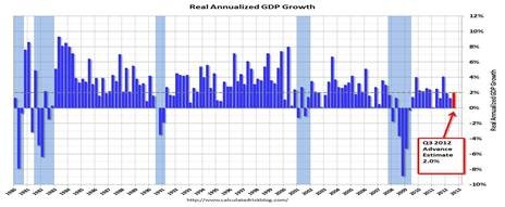 There are many ways to look at the “weak” 2 percent growth numbers for Q3, though just the ‘Advance Estimate’ and so subject to at least 2 more revisions. But such weak growth isn’t due to excessive government regulations (since deregulation has not created greater overall growth, only more recessions). The record low interest rates mean that banks and corporations have too much money to spend, but no place to invest it, since consumers aren’t spending as they used to.