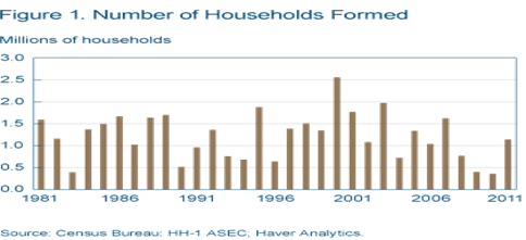 From 1997 to 2007, about 1.5 million households were formed on average each year in the United States. Then the Great Recession hit, and in the ensuing three years, the rate fell to 500,000 per year. This decline in household formation occurred even as the U.S. population was expanding at a rate of 2.7 million per year, only slightly below the rate of 2.9 million a year observed between 1997 and 2007. A “modest” rebound has since followed during the economic recovery, with 1.1 million new households being created in 2011.