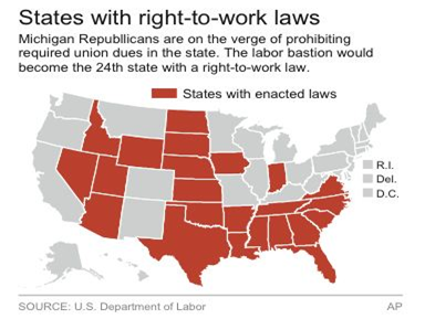 Michigan has become the latest Republican-led effort to wreck economic growth in passing a right-to-work laws that restrict unions. With all apologies to Naomi Klein’s Shock Doctrine, Repubs are no longer waiting for recessions to enrich their wealthiest supporters—such as passing GW Bush tax cuts during the 2001 recession and in 2003 that caused the largest budget deficit in history, precipitating the Great Recession.