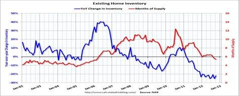 The problem now is inventory, as months of supply have been falling as lenders work off their shadow inventory of defaulted properties. Supply fell sharply to 4.8 months at the current sales rate from 5.3 months in October which was already a multi-year low. The number of existing homes on the market, at 2.03 million, is the lowest since 2001.The good news is that it is boosting home prices.