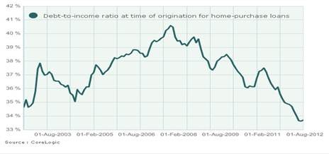 While credit-score standards have increased post-bubble, debt-to-income ratios have been falling. For home-purchase loans, the weighted average debt-to-income ratio at the time of origination is currently around 34 percent, down from a bubble high of about 40 percent. “The average debt-to-income ratios are back to basically the early 2000 levels for reasonable, sustainable mortgage payments,” said Mark Fleming, chief economist for analysis firm CoreLogic. “Apart from credit scores maybe being a little bit too tight, all of the other aspects of the traditional metrics on which you underwrite mortgage loans are really back to reasonable and tried and true levels.”