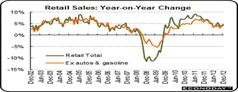 And retail sales are increasing 5 percent per year, almost back to early 2000 levels. Gains were led by furniture & home furnishings, food services & drinking places, and health & personal care. A decline was seen in electronics & appliance stores. Overall consumer spending was moderately healthy in December and likely will lead many economists to bump up their fourth quarter GDP forecast (which had been nudged down last week from a negative international trade report).
