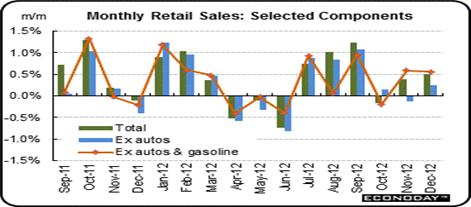 The Commerce Department said consumer spending was moderately strong in December. Retail sales gained 0.5 percent after a 0.4 percent rebound the month before, with automobiles leading the way. That’s 6 percent per year, close to normal sales’ growth. Without autos and gasoline, strength in the core was also broad based. Gains were led by furniture and home furnishings, food services and drinking places, and health and personal care. A decline was seen in electronics and appliance stores.