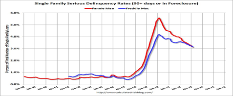 Earlier Freddie Mac (FHLMC), or Federal Home Loan Mortgage Corporation, the other GSE under government conservatorship, reported that the Single-Family serious delinquency rate declined in February to 3.15 percent from 3.20 percent in January. Freddie’s rate is down from 3.57 percent in February 2012, and this is the lowest level since July 2009. Freddie’s serious delinquency rate peaked in February 2010 at 4.20 percent.