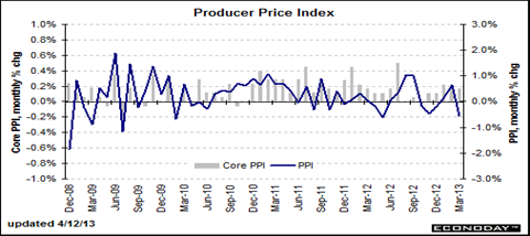 Deflationary tendencies are showing up in the Producer Price Index for wholesale goods, which has been close to zero since the end of the Great Recession. The annual rate in March just dropped to 1.1 percent from 1.8 percent in February (seasonally adjusted). The core rate held steady at 1.7 percent.