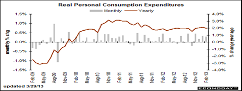 Personal incomes are fluctuating wildly due to the payroll tax increases, so my take is, it ain’t the weather as some pundits are saying! Sure personal income rebounded 1.1 percent in February after a drop of 3.7 percent in January and a 2.6 percent jump in December, as we said last week. But it’s not enough to boost demand. Consumer spending just isn’t holding up, the main reason for government to keep spending.