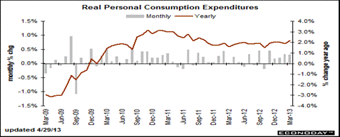 Household wealth, personal income, and spending also continue to increase, while inflation is declining. The Fed looks at Personal Consumption Expenditures (PCE), where overall prices have risen just 1 percent, annually. This is almost in deflation territory, which means the Fed will continue its QE3 purchases of Treasury bonds and mortgages. This is good for consumer spending, but signals less demand for consumer goods. Overall consumption spending is up 3.5 percent annually in March, a good number, vs. personal incomes that have been hovering around 2.5 percent.
