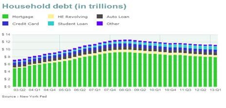 The total amount of debt held by Americans fell again in the first three months of 2013 and stood at the lowest level since the middle of 2006, the New York Federal Reserve said Tuesday. The level of household debt fell by $110 billion, or 1 percent, to $11.23 trillion, mainly because consumers reduced their mortgage obligations and used credit cards less. Household debt is now 11.4 Percent lower vs. a peak of $12.68 trillion in 2008.