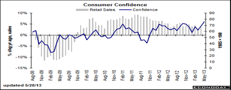 Says Lynn Franco, Director of Economic Indicators at The Conference Board: “Consumer Confidence posted another gain this month and is now at a five-year high (Feb. 2008, Index 76.4). Consumers’ assessment of current business and labor-market conditions was more positive and they were considerably more upbeat about future economic and job prospects. Back-to-back monthly gains suggest that consumer confidence is on the mend and may be regaining the traction it lost due to the fiscal cliff, payroll-tax hike, and sequester.”
