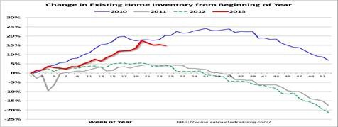 Even better news is that inventories of existing homes continue to increase from record lows as banks continue to decrease their holdings of distressed homes. So far in 2013, inventory is up 14.9 percent, according to Housing Tracker. But inventory is still very low, down 15.8 percent from the same week last year according to Housing Tracker.