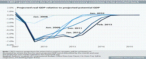 The Congressional Budget Office recently released its updated Budget and Economic Outlook, which highlighted a key theme that recurs in many economic policy discussions: a rapid recovery is projected to begin relatively soon and to reliably deliver the economy back to full health in about four years. The problem is that this full recovery has generally been forecast to be four years away since the Great Recession began five years ago, says the Economic Policy Institute.