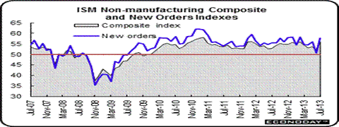 The latest economic data show a possibility of pickup in the fall, which is what the Fed’s deficit hawks are counting on to justify their call for an early end to QE3. Specifically, both the Institute of Supply Management’s service and manufacturing surveys rose sharply in July. The ISM’s non-manufacturing report showed the largest surge that drove the composite index up a very substantial 3.8 points to 56.0 for the best reading since February. New orders, the key component in the report, rose nearly 7 points to 57.7 for its best reading since December. And overall business activity really took off, up more than 7-1/2 points to 60.4, also the best reading since December.