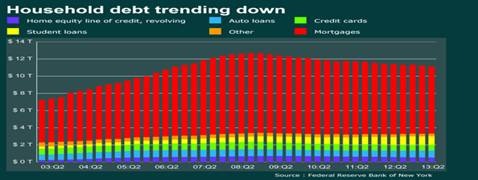 Household debt is declining, but ever so slowly. In Q2 2013 total household indebtedness fell to $11.15 trillion; 0.7 percent lower than the previous quarter and 12 percent below the peak of $12.68 trillion in Q3 2008, said the New York Federal Reserve in its latest Household Debt and Credit Report. Mortgages, the largest component of household debt, fell $91 billion from the first quarter.