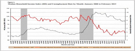 This graph from Ezra Klein’s WaPo blog illustrates how much household incomes have fallen, as well. Back in 2007, for instance, median household income was $55,438. That’s declined to $51,404 in February 2013. Those numbers are pretax and adjusted for inflation and seasonal factors. The red line is median household income and blue line the unemployment rate, which is still 7.4 percent.