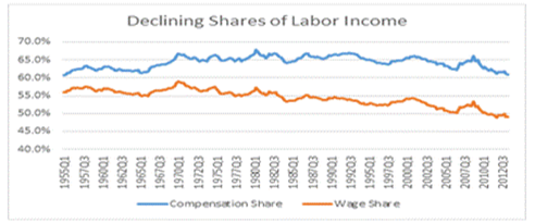 Economist Jared Bernstein said as much in a recent New York Times column, illustrated in the Economix graph from 1995 to Q3 2012:  “In fact, as many inequality watchers have noticed, profits as a share of income are at or near record highs while the compensation share is around a 50-year low.” And as Robert Samuelson also reported in the Washington Post, “…labor’s share has plunged in the past decade. In 2013, it’s 57 percent (vs. 63 percent in 2000). This shifts about $750 billion annually from labor to capital.”