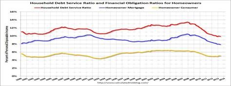 Also the homeowner’s financial obligation ratio for mortgages (blue line in graph) is at a new record low. This ratio increased rapidly during the housing bubble, and continued to increase until 2008. With falling interest rates, and less mortgage debt (mostly due to foreclosures), the mortgage ratio has declined to an all time low, said the Federal Reserve report.