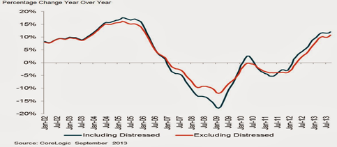 Meanwhile, CoreLogic reports that home prices nationwide, including distressed sales, increased 12 percent on a year-over-year basis in September 2013 year over year. This change represents the 19th consecutive monthly year-over-year increase in home prices nationally. On a month-over-month basis, including distressed sales, home prices increased by 0.2 percent in September 2013 compared to August 2013.