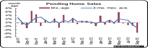 The unanswered question to date is how the debt ceiling impasse and government shutdown has affected economic activity. Both the industrial and service sectors have shown stronger growth, according to the Institute of Supply Management (ISM). But real estate is another story. Pending home sales in the NAR’s Pending Home Sale Index doesn’t look good. The index that measures home sales under contract, but not closed, has been declining for 4 months, a sure sign that housing sales, at least, are faltering.