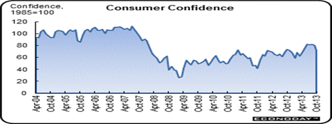 This is in part because consumer confidence is faltering, as consumers lose confidence in government’s ability to function. The shutdown endangered much more than 800,000 furloughed defense workers. Combined with huge cuts in food stamps, no farm aid bill, and a not yet functioning Affordable Care Act, the shutdown and debt ceiling impasse has spooked consumers big time.