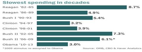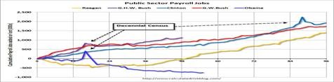 Democrats have bought the Republican lie that Democrats were the big spenders, it seems, with the draconian federal budget cuts enacted over the past 2 years. But recent statistics show it’s been the Republicans since 1980 that created the most state and federal government jobs—4,289,000 under the Reagan and 2 Bush administrations, whereas Clinton created 1,934,000 jobs, while 752,000 government jobs have been lost to date during the Obama Administration.