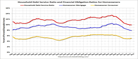 Consumer debts have declined to the lowest level in 30 years, according to the Federal Reserve’s just released Q2 2013 Household Debt Service and Financial Obligations Ratios report. This will boost consumer spending, and housing values. The enclosed graph dating back to 1980 shows that the overall Household Debt Service ratio (red line) is actually lower than it was in 1980, while the Homeowner Mortgage (blue line) and Consumer (yellow line) ratios are back to 1980 levels.