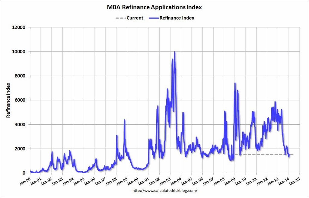 But it is down to its lowest level during the Great Recession. The MBA’s purchase applications index is also down for the year. This is mainly due to rise in mortgage rates of some 1 percent since April and former Fed Chairman Bernanke’s announcement that QE3 would begin to end sometime this year.