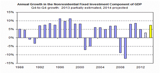 There are other factors, as well, such as the pickup in consumer spending with higher December retail sales, and consumer confidence. This could lead to a GDP growth rate in the mid-3 percent range for 2014, up from the average 2 percent growth rate of late. It is a huge jump and just reflects the pent up demand for everything, as household balance sheets are turning positive and businesses begin to spend the cash they have been hoarding.