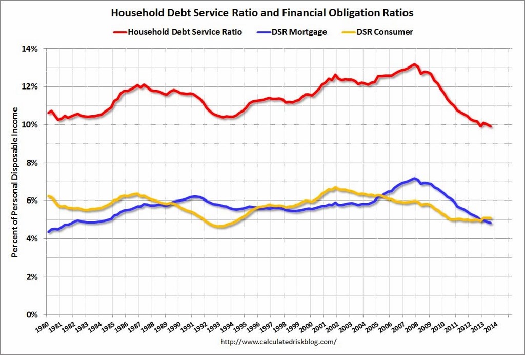 And household debt, as measured by the Federal Reserve’s Household Debt Service Ratio of mortgage and consumer loans to Disposable Income, has been declining steadily, and is now below 1980 levels. This is freeing up consumers’ incomes to spend more, needless to say, and a sign of better economic growth for 2014.
