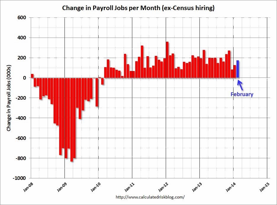 Those wanting smaller government sometimes forget that these jobs enhance present and future productivity—creating a safer and healthier work environment, as well as better educational opportunities. The 175,000 net nonfarm payroll jobs created in February included some of those workers, but only a net 13,000 public sector jobs were created, whereas 16,000 public sector jobs were lost in January.