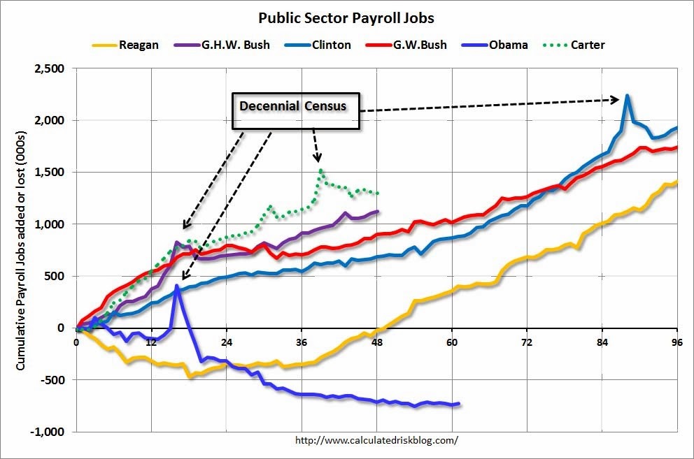 This Calculated Risk graph shows public sector job creation since President Carter, with Carter and HGW Bush leading the way, and Presidents Clinton and GW Bush close behind.