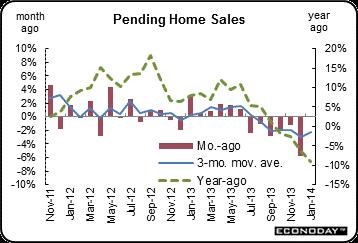 The Pending Home Sales Index (PHSI), a forward-looking indicator based on contract signings, dipped 0.8 percent to 93.9 from a downwardly revised 94.7 in January, and is 10.5 percent below February 2013 when it was 104.9. The February reading was the lowest since October 2011, when it was 92.2.