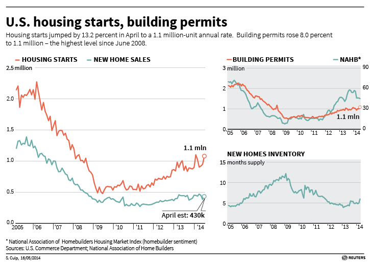 The housing starts report suggested building activity would likely continue to rise for some time, according to Inside Debt, as permits to build homes jumped 8.0 percent to a 1.08 million unit pace in April. Permits for single family homes, however, rose just 0.3 percent. Permits for multifamily housing soared 19.5 percent.