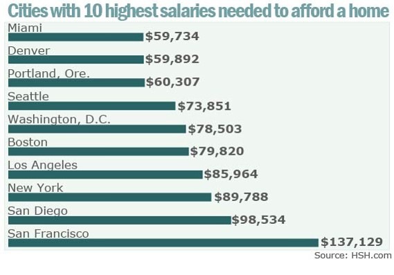Residents of the five cities that need the lowest annual salary to afford a median-priced home were: Cleveland ($29,788), Pittsburgh ($30,177), St. Louis ($31,275), Cincinnati ($31,850) and Detroit ($32,250). The five least-affordable cities were: Boston ($79,820) Los Angeles ($85,964) New York City ($89,788), San Diego ($98,534) and San Francisco ($137,129).