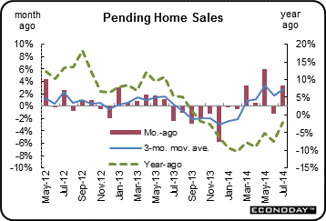 The National Association of Realtors’ monthly Pending Home Sales index rose 3.3 percent in July over June but is still 2.1 percent below its level in July 2013. It’s rising again because both consumer confidence measures have been rising of late, buoyed by rising incomes and low inflation.